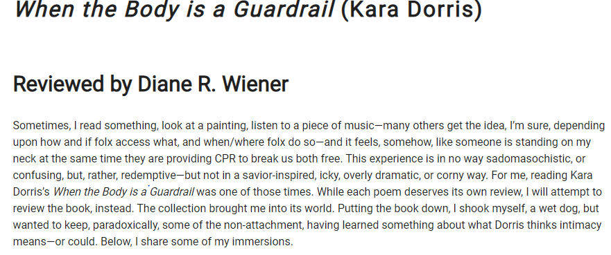 I dare you to enter Kara Dorris’ brutal and astounding HitBox, where we begin “curled up, practicing crash / positions, hearts cradled by claws & wings.” Part fairytale, part video game, part self-defense manual, these poems plumb the limits of empathy, the inextricability of pain and healing, and the relentlessness of violence. “You have to hold on & ride, arrive / on the other side despite the hits.” Dorris deftly shows us how—how to aim, let go, and “brace for the breaking” in a world where a princess needs an “army knife, a Glock, & some duct tape” just in case the rescue turns assault.
